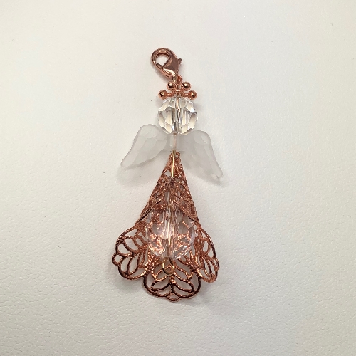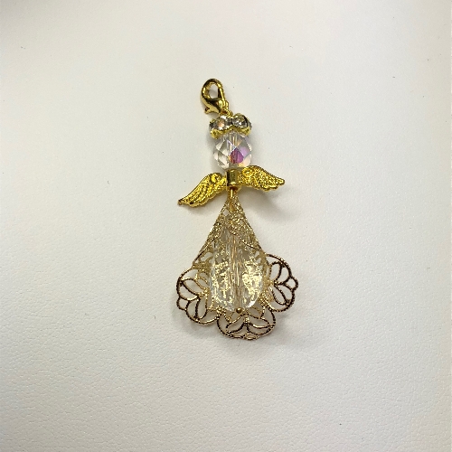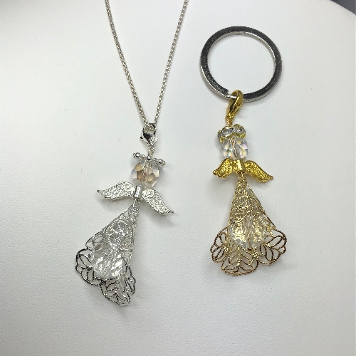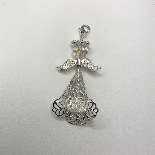 This beautiful fancy Guardian Angel has been handmade with a beautiful sparkling teardrop Swarovski Crystal (18mm x 13mm) for the body and encased in a filigree cone, with an 8mm round crystal for the head. The Angel has a lobster clasp at the top of the head. (Please note: Price is for one only. Keyring and Chain are not included)