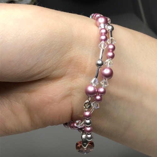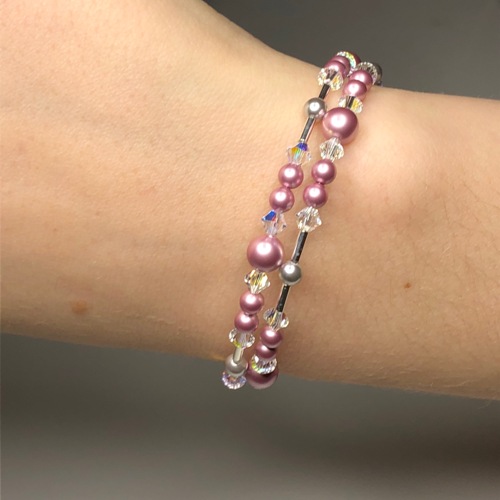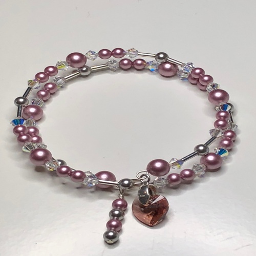 Handmade 2 coil wrap bracelet with Swarovski Crystal 4 & 6mm Powder Pink and Light Grey pearl beads, Swarovski 4mm bicone crystal beads in Crystal Ab and Sterling Silver tube beads, The bracelet is finished with a couple of charms, one side has a 10mm Swarovski Crystal Blush Rose heart on a Sterling Silver bail and the other side has a Sterling Silver, pearl beads dangle. This bracelet is made using silver plated memory wire, which holds it's shape and wraps around easily on and off the wrist, no clasps no fuss.