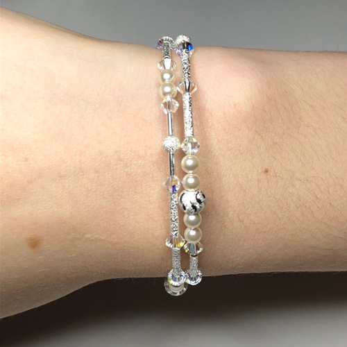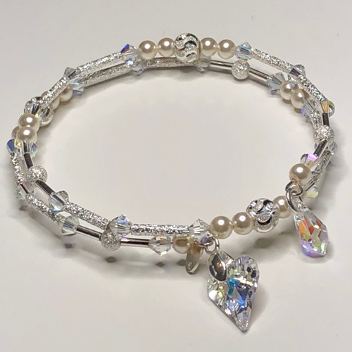 Handmade 2 coil wrap bracelet with Swarovski Crystal 4mm Cream pearl beads, Swarovski 4mm bicone crystal beads in Crystal Ab, Sterling Silver plain and frosted tubes, 4 & 6mm frosted round beads, The bracelet is finished with a couple of charms, one side has a 11mm Swarovski Crystal Drop in Crystal Ab on a Sterling Silver bail and the other side has a Swarovski Crystal Wild Heart Crystal Ab on a Sterling Silver bail. This bracelet is made using silver plated memory wire, which holds it's shape and wraps around easily on and off the wrist, no clasps no fuss.