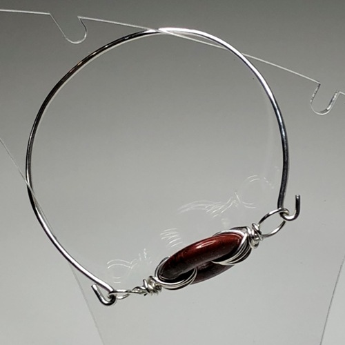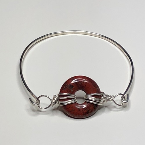 Handcrafted Fine Silver bangle with a semi precious brecciated Poppy Jasper gemstone donut (20mm) wrapped in Sterling Silver wire.