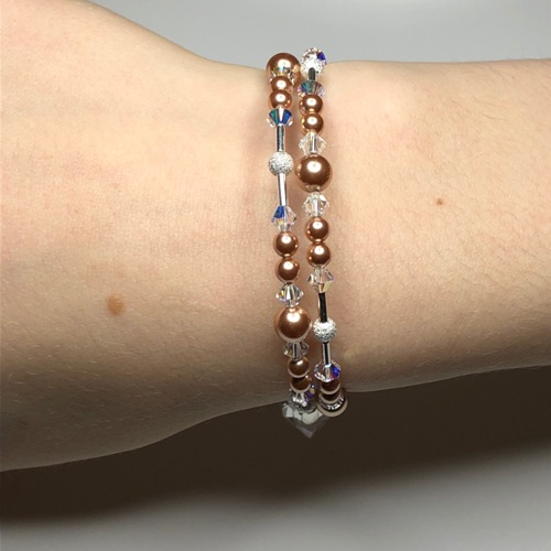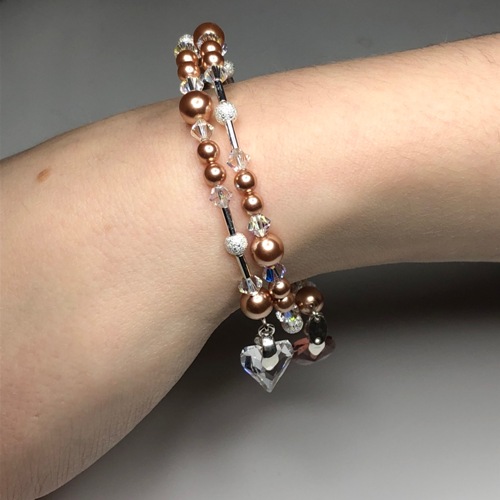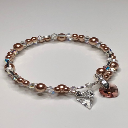 Handmade 2 coil wrap bracelet with Swarovski Crystal 4 & 6mm Powder Pink and Light Grey pearl beads, Swarovski 4mm bicone crystal beads in Crystal Ab and Sterling Silver tube beads, The bracelet is finished with a couple of charms, one side has a 10mm Swarovski Crystal Blush Rose heart on a Sterling Silver bail and the other side has a Sterling Silver, pearl beads dangle. This bracelet is made using silver plated memory wire, which holds it's shape and wraps around easily on and off the wrist, no clasps no fuss.
