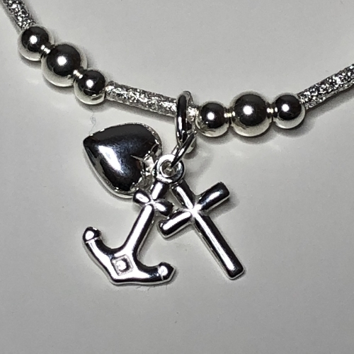 This stunning stretch bracelet has been handmade using sterling silver plain and frosted beads in 5mm, 4mm, 10mm tubes and with a beautiful trio charm consisting of a puff heart, cross & anchor. The bracelet has been made with jewellers stretch cord, securely fastened with minimal visibility.