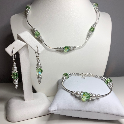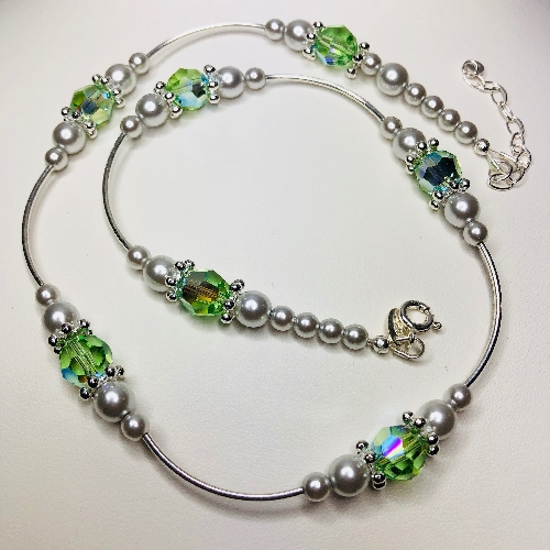 This stunning necklace has been made with Sterling Silver curved tubes, beautiful sparkling Swarovski 8mm round crystals in Peridot, 6mm & 4mm light grey glass pearl beads and silver snow flake spacers. The necklace is finished in Sterling Silver with a Sterling Silver bolt ring clasp and an extension chain.