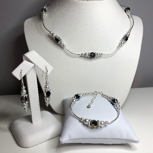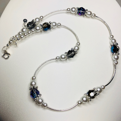 This stunning necklace has been made with Sterling Silver curved tubes, beautiful sparkling Swarovski 8mm round crystals in Midnight Blue, 6mm & 4mm light grey glass pearl beads and silver snow flake spacers. The necklace is finished in Sterling Silver with a Sterling Silver bolt ring clasp and an extension chain.