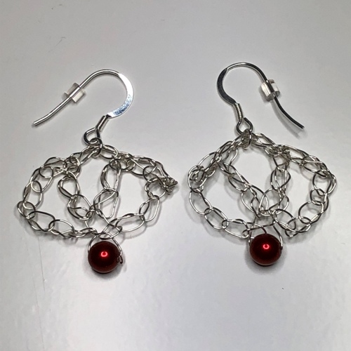 I hand crocheted this pair of earrings with Sterling Silver fine gauge wire and added 1 claret glass pearl bead to each earring (6mm). They have been hung on Sterling Silver ear hook wires. These earrings are one of a kind.