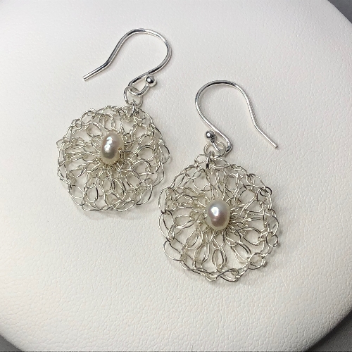 I hand crocheted this pair of earrings with Sterling Silver fine gauge wire, a beautiful circular crochet design with a Freshwater Pearl semi-precious gemstone in the centre. They hang on Sterling Silver ear hook wires.