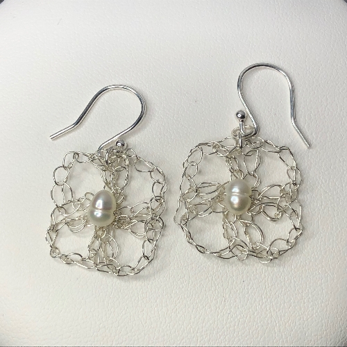 I hand crocheted this pair of earrings with Sterling Silver fine gauge wire, a beautiful square crochet design with a Freshwater Pearl semi-precious gemstone in the centre. They hang on Sterling Silver ear hook wires.
