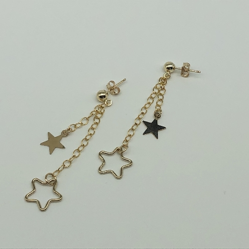 Beautiful handmade 14ct rolled gold stud drop earrings, with a 10mm closed ring star and an 8mm star charm suspended on chains and attatched to 4mm studs with scrolls.