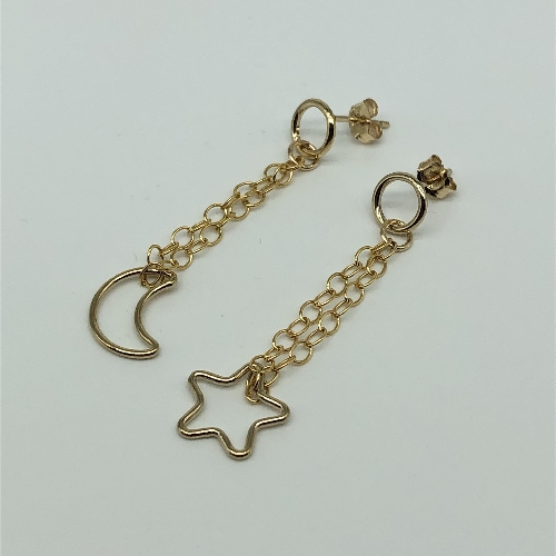 Handmade 14ct rolled gold 'circle of life' stud drop earrings, with a 11 x 8mm closed ring crescent moon suppended on a chain on one earring and a 10mm closed star suspended on a chain on the other.