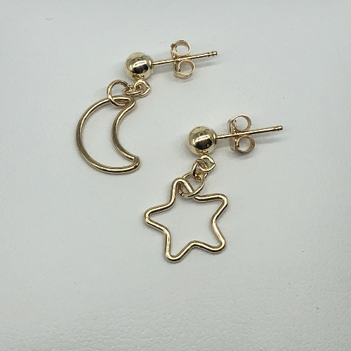 Handmade 14ct rolled gold stud earrings, with a 11x8mm closed ring crescent moon attatched to one stud and a 10mm closed ring star attatched to the other stud.