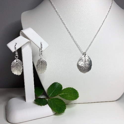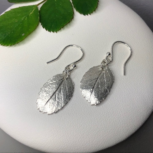 This stunning pair of Rose leaf earrings was handcrafted using Silver paste in Fine Silver (999) painted on to real Rose leaves, capturing the beautiful leaf detail. The leaves are attached to Sterling Silver ear hooks. (Matching Leaf Pendant available - See the Pendants section)