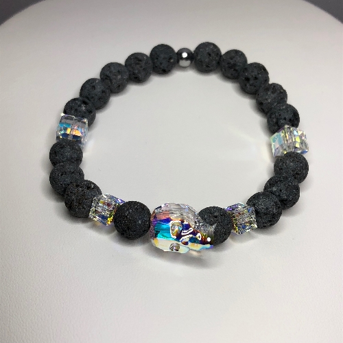 This handmade stretch bracelet has a stunning Swarovski Crystal Skull in colour Crystal AB as the focal point and is surrounded by raw Lava semi precious gemstone beads in 8mm, matching Swarovski Crystal square beads in 6mm & 8mm and a 5mm silver Hematite semi precious gemstone bead. The bracelet has been made with jewellers stretch cord, securely fastened with minimal visibility.