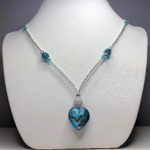 This beautiful necklace has a gorgeous genuine Murano glass heart as it's central focus, the Murano glass heart has a white core with clouds of sparkly Aventurine around and encased in blue glass, above the heart is a Sterling Silver frosted bead capped with silver spacers and crystal rondelle spacers. The necklace is then made up with silver seed beads and complementary beautiful Swarovski Crystals. The necklace is finished in Sterling Silver with a Sterling Silver bolt ring clasp. This necklace is 'One of a Kind'.