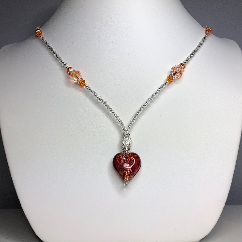 This beautiful necklace has a gorgeous genuine Murano glass heart as it's central focus, the Murano glass heart has gold leaf within the coloured glass giving it a beautiful orangy/tan colour, above the heart is a Sterling Silver frosted bead capped with silver spacers and crystal rondelle spacers. The necklace is then made up with silver seed beads and complementary beautiful Swarovski Crystals. The necklace is finished in Sterling Silver with a Sterling Silver bolt ring clasp. This necklace is 'One of a Kind'.