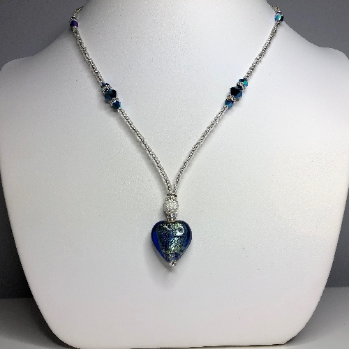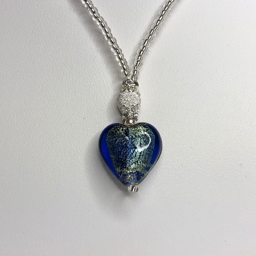 This beautiful necklace has a gorgeous genuine Murano glass heart as it's central focus, the Murano glass heart has Gold leaf within the blue glass giving it a beautiful deep bluey gold colour, above the heart is a Sterling Silver frosted bead capped with silver spacers and crystal rondelle spacers. The necklace is then made up with silver seed beads and complementary beautiful Swarovski Crystals. The necklace is finished in Sterling Silver with a Sterling Silver bolt ring clasp. This necklace is 'One of a Kind'.