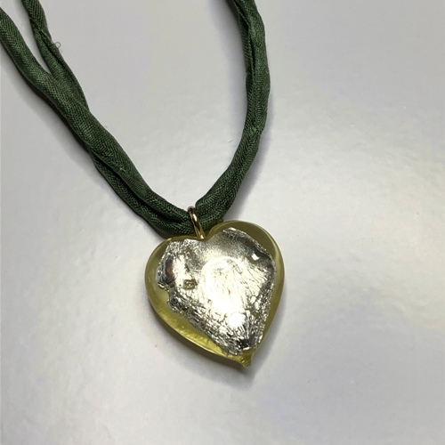 Hand dyed 100% Silk double cord necklace in Olive with a yellow silver foiled Lampwork heart pendant. Sterling Silver ends and bolt ring clasp.