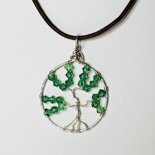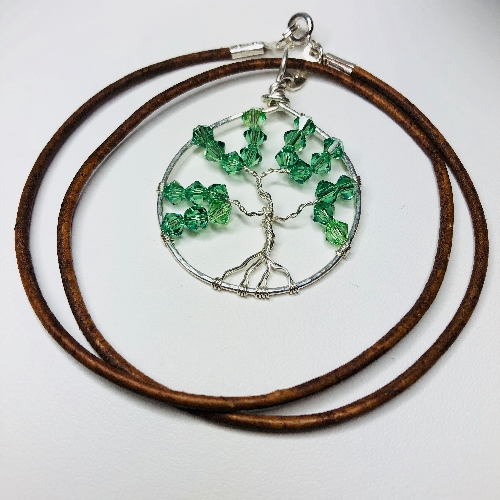 This beautiful handcrafted Sterling Silver Spring Tree of Life pendant has been shaped by hand using two grades of Sterling Silver wire. The thicker wire forms the circle and self bail while the thinner wire was used to create the tree with Swarovski bicone crystals threaded on the branches to resemble the spring leaves. The pendant is hung on a Greek Leather cord necklace finished with Sterling silver ends and a Sterling Silver bolt ring clasp.